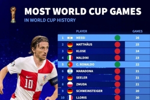 世界杯历史出场排名:梅西26场最多,C罗22场、莫德里奇19场